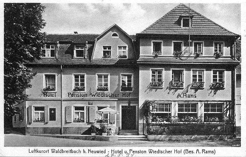 Frühe Ansichtskarte von 1901: Wiedischer Hof von Karl Nalbach mit Heilstätte (jetzt Westerwaldklinik)Das abgebildete Haus ‚WiedischerHof‘,1945 durch Kriegseinwirkung mit allen Nebenbauten total zerstört, war 1904 durch den Hotelfachmann Peter Pütz übernommen worden. Um dem Anspruch der Gäste gerecht zu werden ließ er 1907 im gepflasterten Innenhof seines Hotels eine ‚Carbid-Gasanlage‘ als Energiequelle für die gesamte Hausbeleuchtung installieren. Anton Rams, inzwischen mit der Witwe Pütz verheiratet, renovierte 1924/26 den Hotelbau umfassend, um mit entsprechendem Komfort für das steigende Gästeaufkommen des s.Z.aufstrebenden Erholungsortes gerüstet zu sein. Er nutzte 1929, als die Wiedbrücke in Waldbeitbach neu gebaut wurde, die technische Erfahrung der Brückenbauer. Der dort beauftragte Unternehmer errichtete für den zentralen Gastraum stabile, tragfähige Pfeiler und Unterzüge. Dadurch wurde eine neue großzügige, raumprägende Gestaltung der neuen Gaststätte erreicht.